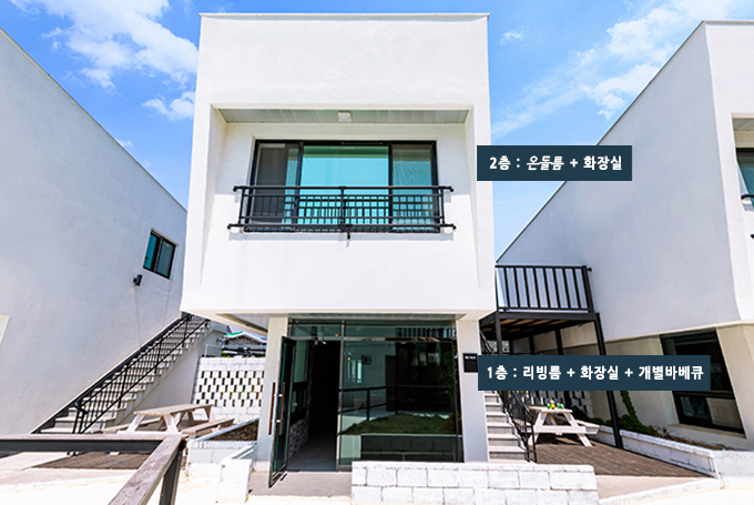 - 독채 (1F : 리빙룸+화장실+개별바비큐 / 2F : 온돌룸+화장실)